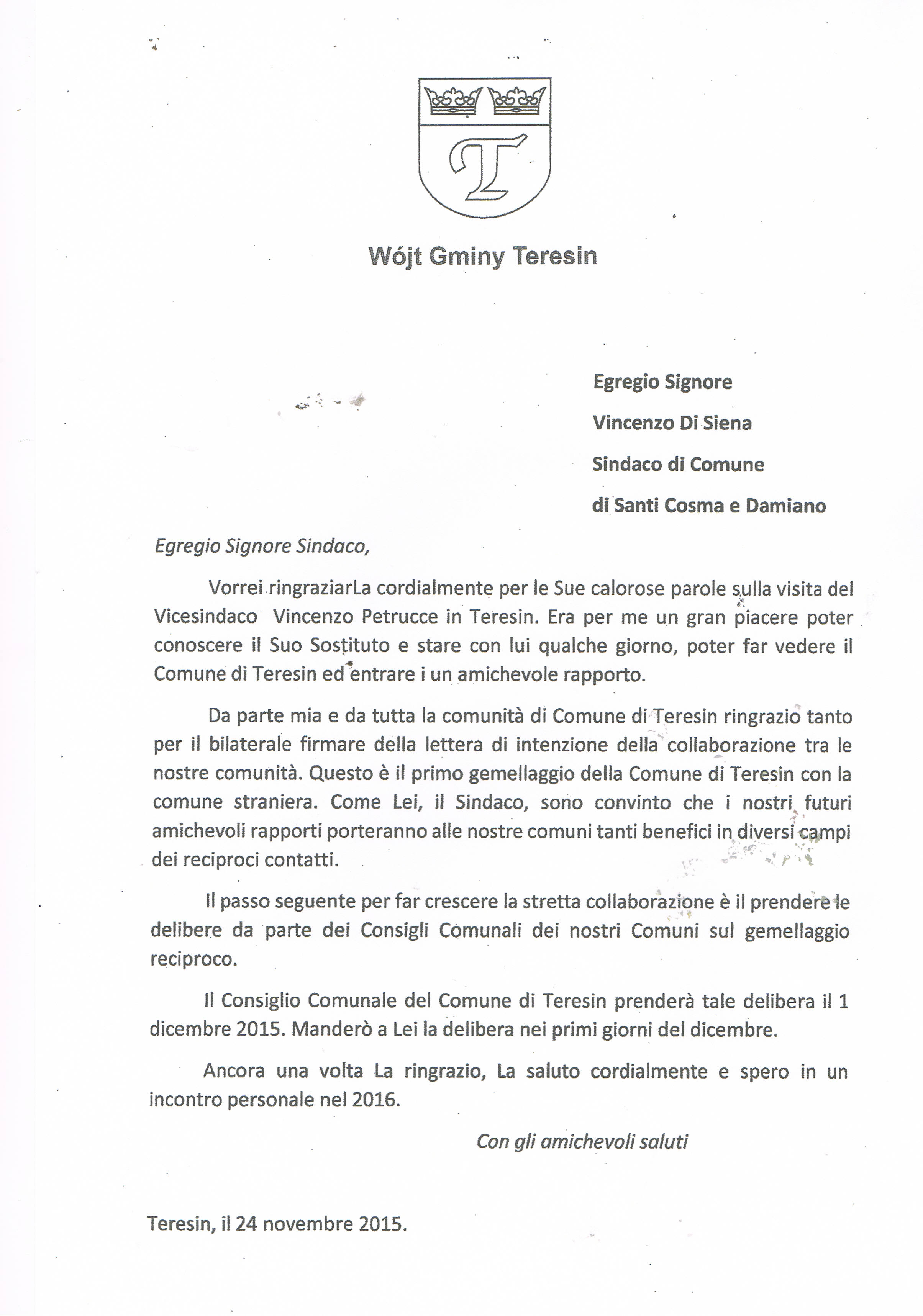 Il comune di Santi Cosma e Damiano ha stretto un patto di amicizia con il Comune polacco di Teresin, per avviare un percorso di partnership e contatti di gemellaggio.