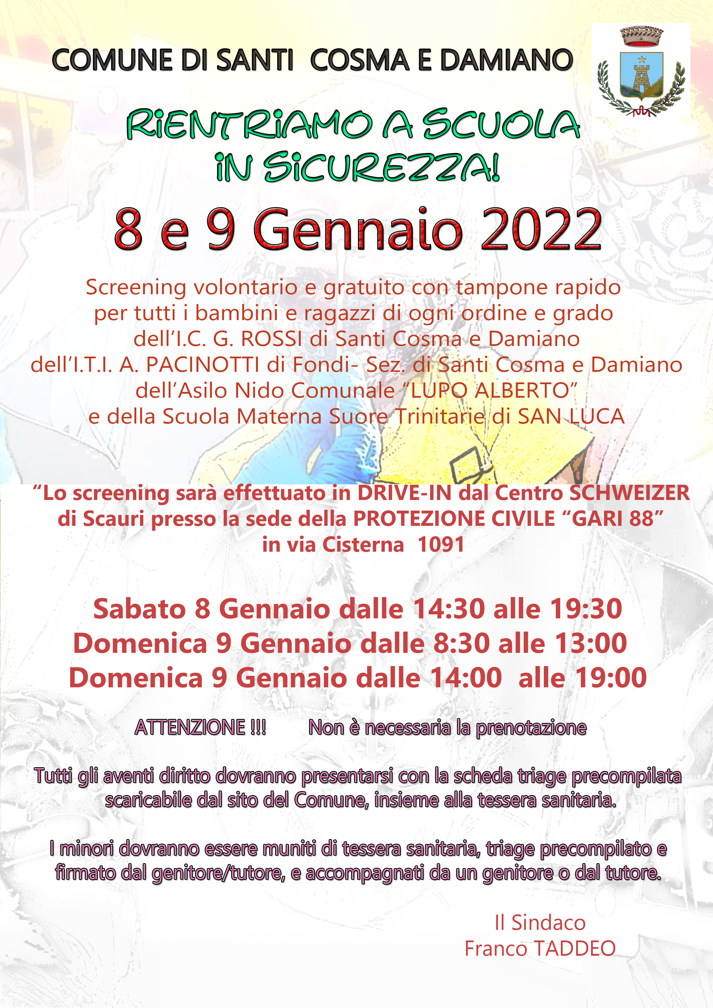 Screening volontario e gratuito con tampone rapido per tutti i bambini e ragazzi di ogni ordine e grado dell'I.C. ROSSI, dell'I.T.I. PACINOTTI , dell'Asilo NIdo Comunale, e Scuola Materna di SAN LUCA.