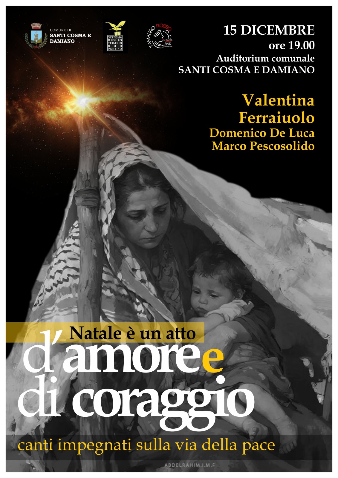 La Biblioteca Comunale di Santi Cosma e Damiano, in collaborazione con il S.B.S.P., organizza lo spettacolo "Natale è un atto di amore e di coraggio" - Canti impegnati sulla via della pace, a cura di Valentina Ferraiuolo, Domenico De Luca e Marco Pescosolido, che si terrà lunedì 15 dicembre alle ore 19.00 presso l'Auditorium Comunale di Santi Cosma e Damiano. L'Amministrazione Comunale, con questo evento, intende indurre alla riflessione su un tema molto attuale, come l'esigenza di Pace. Vi aspettiamo numerosi, tutti uniti per esprimere un sentimento di pace.