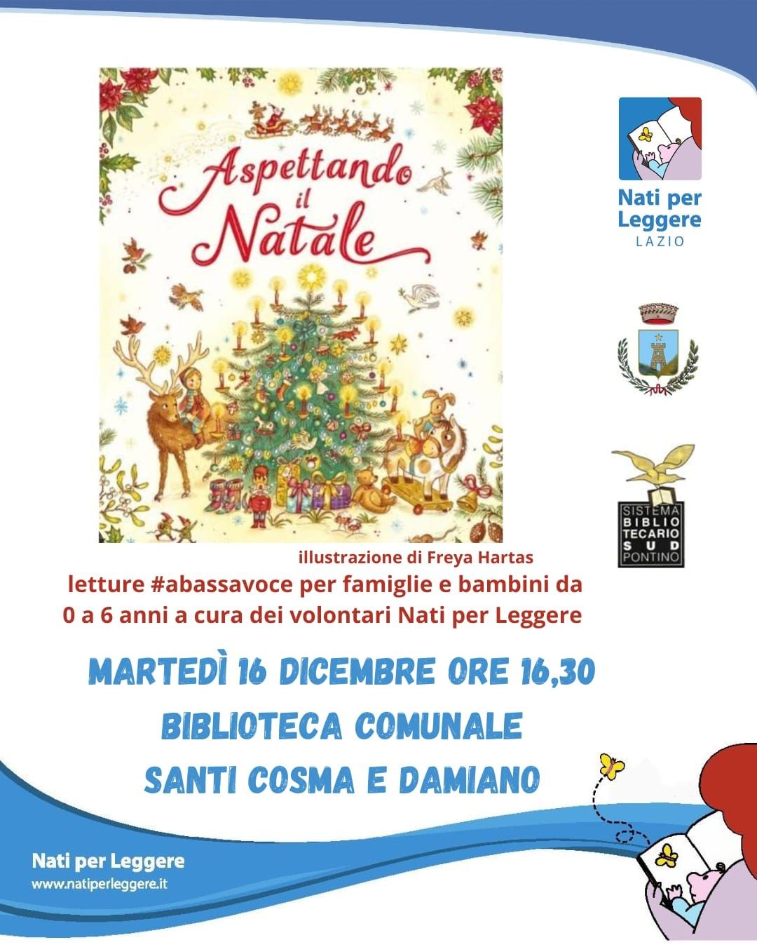 La Biblioteca di Santi Cosma e Damiano invita le famiglie e i bambini a partecipare all'incontro "Aspettando il Natale" organizzato nell'ambito del progetto "Nati per Leggere in Biblioteca", che si terrà il giorno 16 dicembre alle ore 16:30 presso la Biblioteca Comunale. I bibliotecari e i volontari NpL accompagneranno i bambini con letture adatte alla loro età.